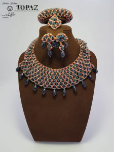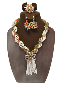 كريستال‭ ‬ومرجان‭ ‬صناعي‭ ‬باللون‭ ‬البرتقالي‭ ‬المائل‭ ‬إلى‭ ‬الأحمر‭ ‬في‭ ‬تصميم‭ ‬يتميز‭ ‬بطريقته‭ ‬الفريدة‭ ‬و‭ ‬ألوانه‭ ‬المُميزة‭ ‬جداً‭ ‬طقم‭ ‬كامل‭ ‬من‭ ‬العقد‭ ‬مع‭ ‬أقراط‭ ‬و‭ ‬اساور‭ ‬بإضافة‭  ‬خاتم‭ ‬متناغم‭ ‬مع‭ ‬باقي‭ ‬الطقم‭ ‬